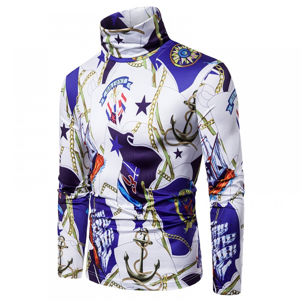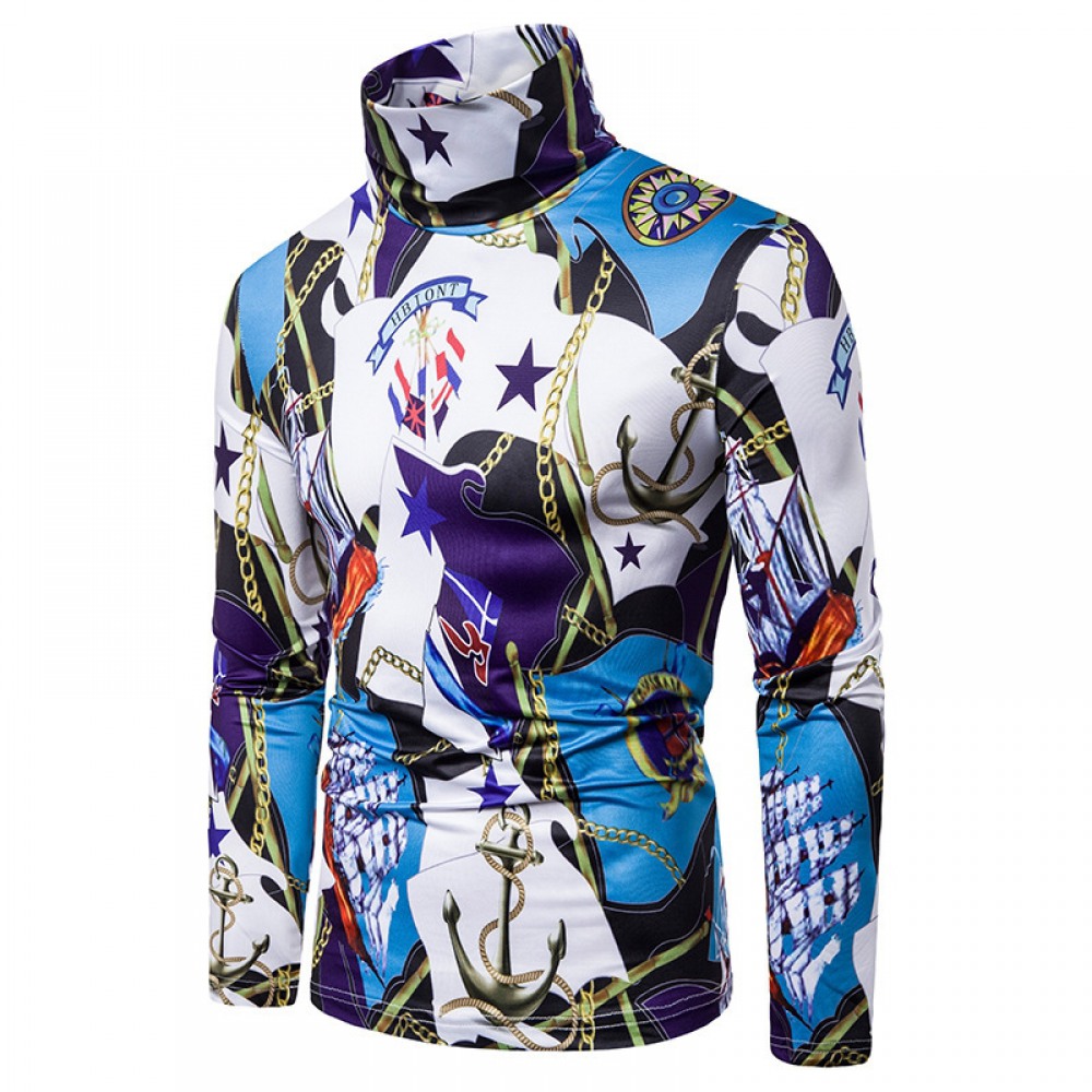 New Men's Large Size 3D Chain Print High Neck Long Sleeve T-Shirt Bottoming Shirt