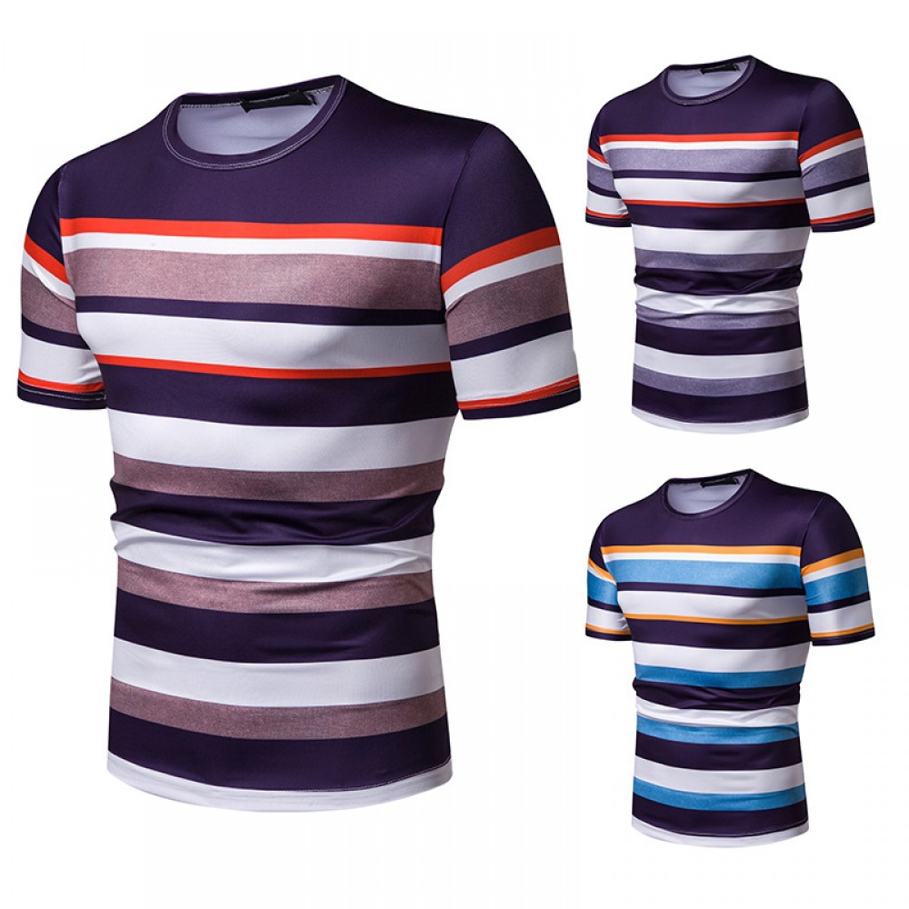New Summer Men's Short-Sleeved T-Shirt Contrast Striped Slim Casual T-Shirt