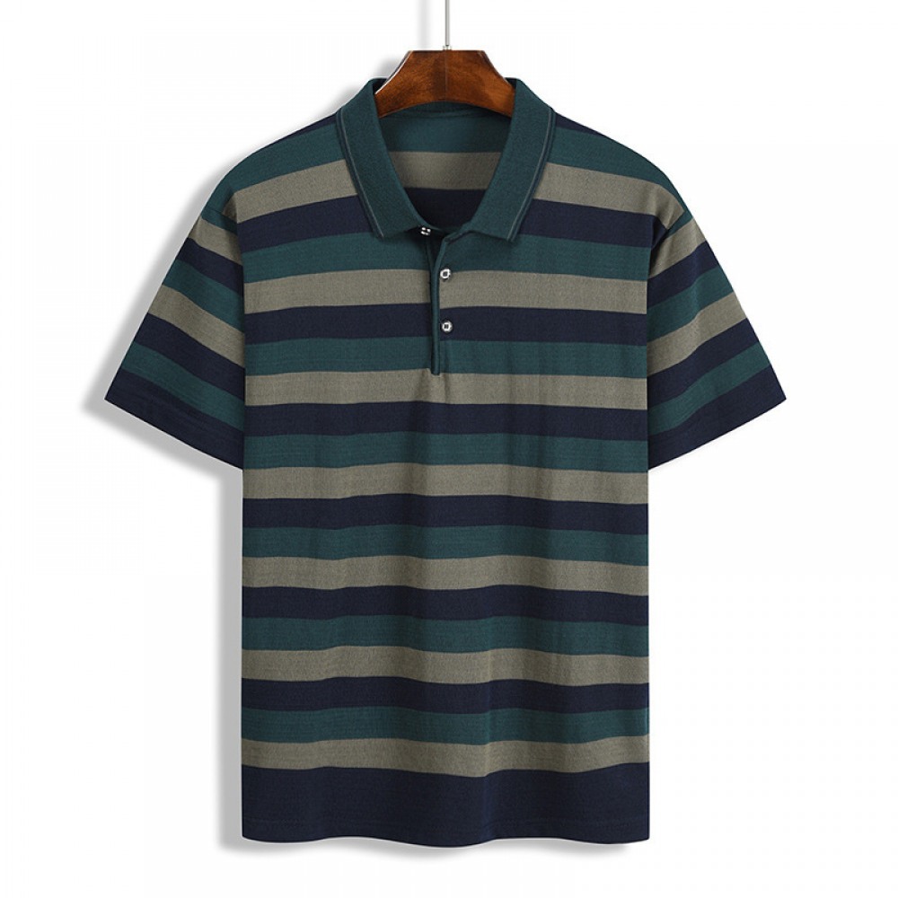 Summer T-Shirt Striped Color Matching Pockets Men's Lapel Short-Sleeved Top