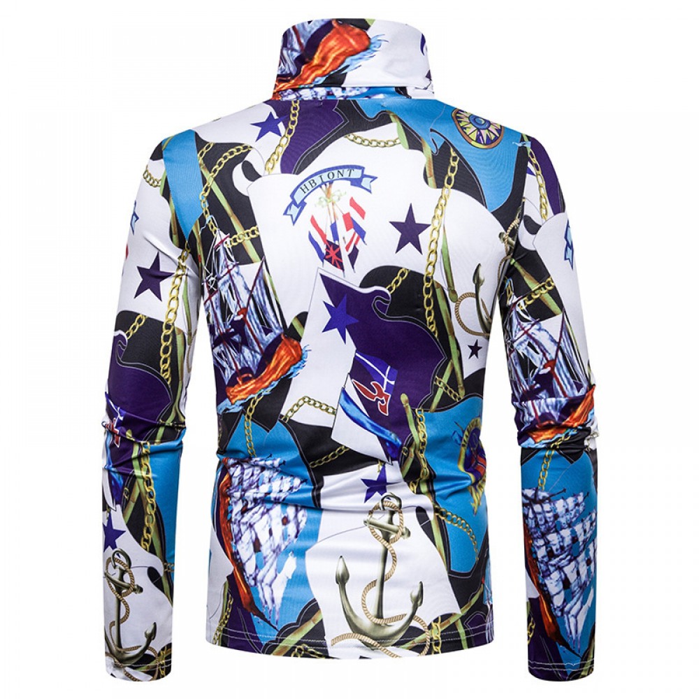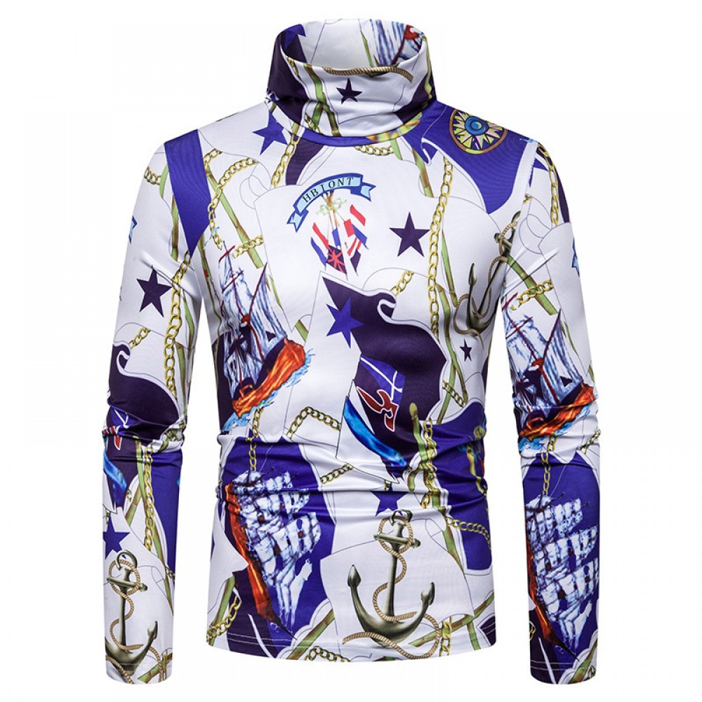 New Men's Large Size 3D Chain Print High Neck Long Sleeve T-Shirt Bottoming Shirt