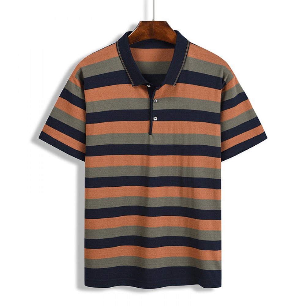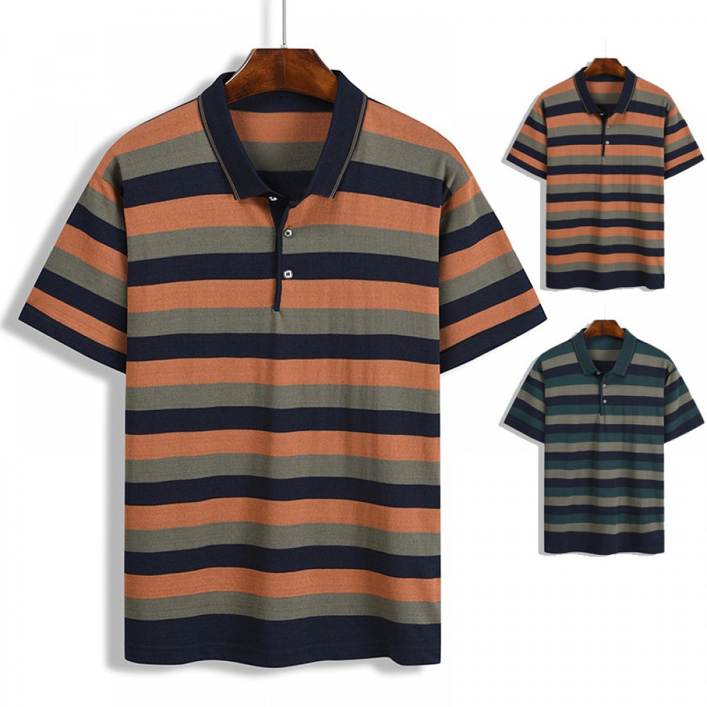 Summer T-Shirt Striped Color Matching Pockets Men's Lapel Short-Sleeved Top